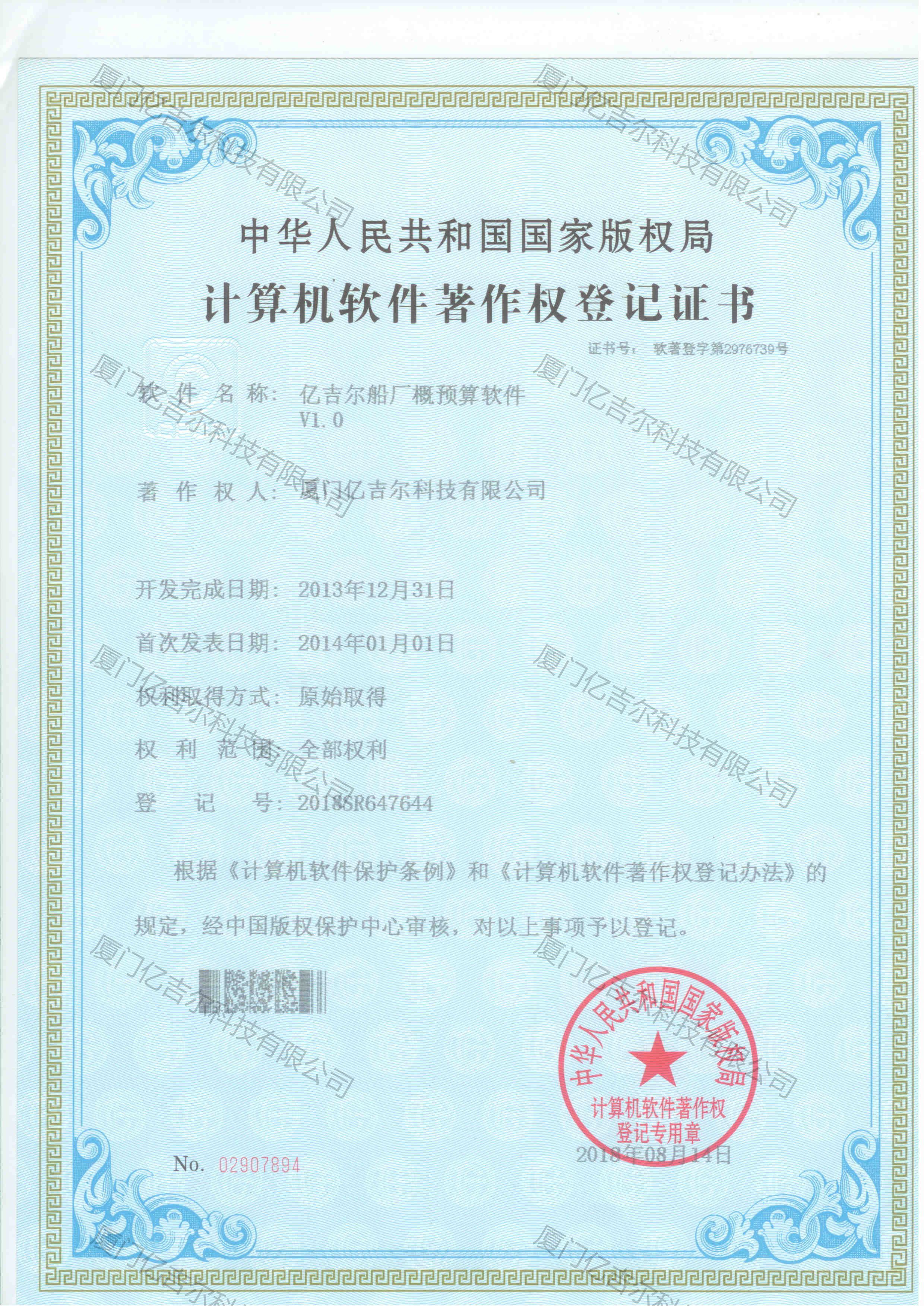 億吉爾船廠概預(yù)算軟件著作權(quán)登記證書 發(fā)布日期:2018年08月14日 瀏覽次數(shù):3816 關(guān)鍵字: 公司 1/1億吉爾船廠概預(yù)算軟件著作權(quán)登記證書