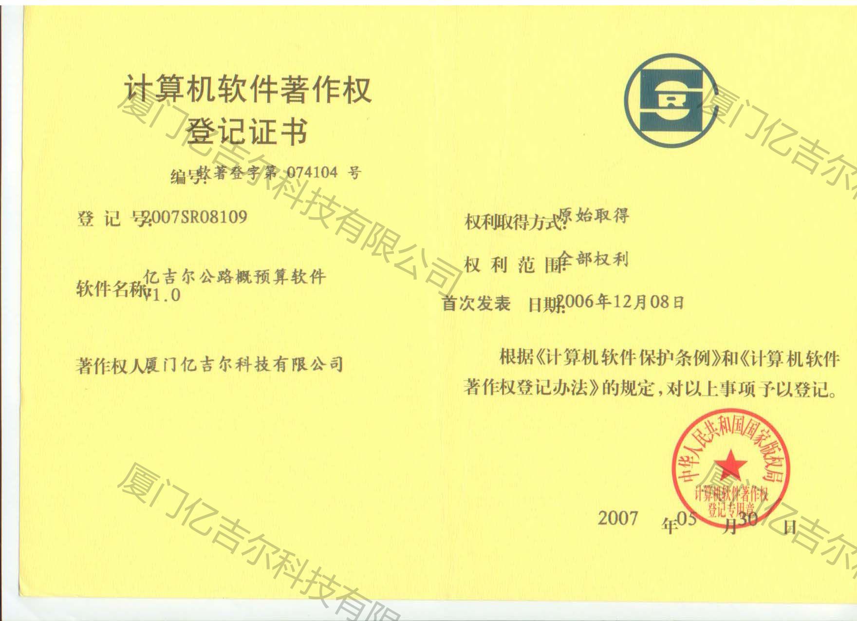 億吉爾公路概預(yù)算軟件著作權(quán)登記證書(shū) 發(fā)布日期:2007年05月30日 瀏覽次數(shù):3529 關(guān)鍵字: 公司 1/1億吉爾公路概預(yù)算軟件著作權(quán)登記證書(shū)