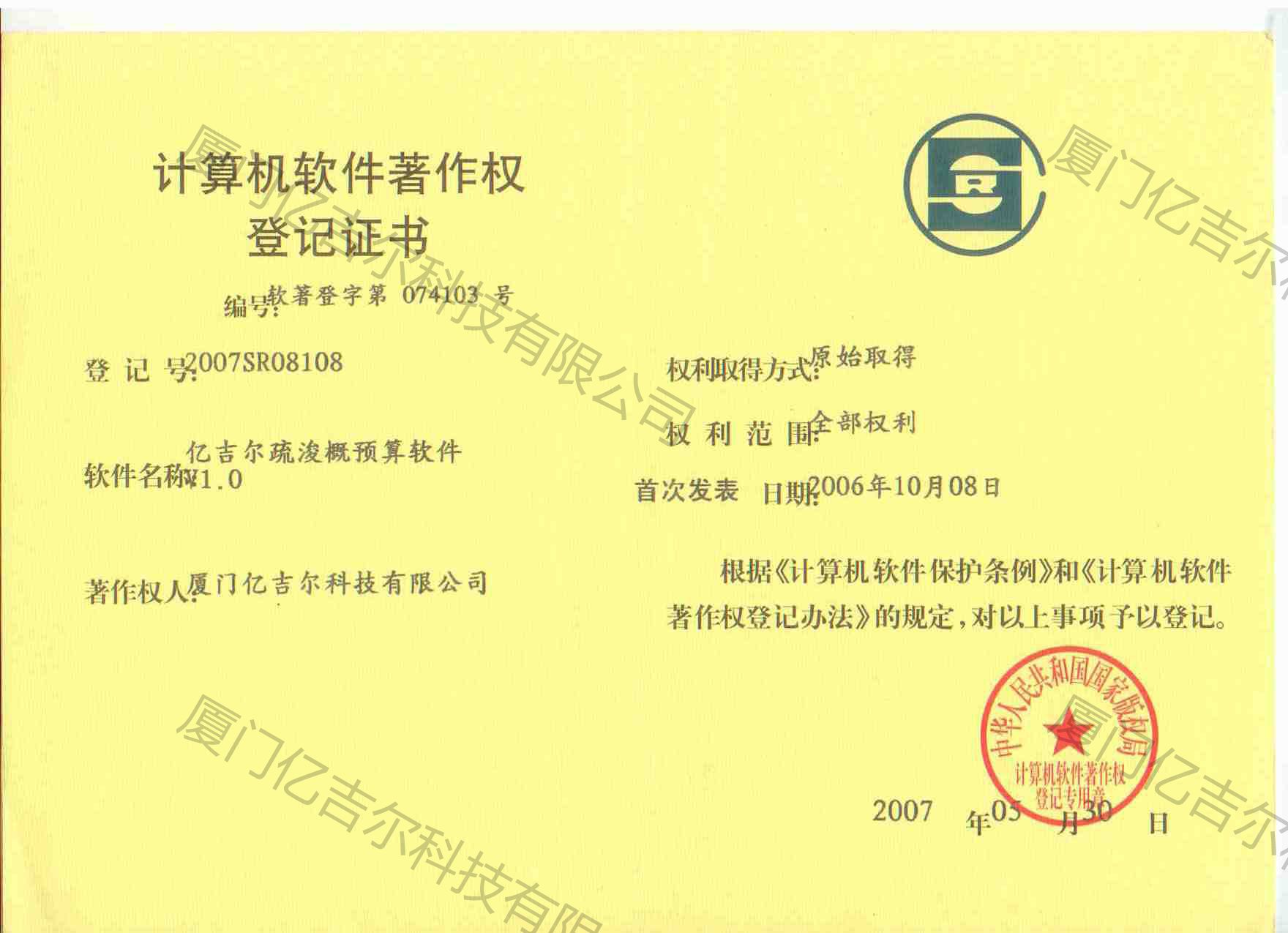 億吉爾疏浚概預(yù)算軟件著作權(quán)登記證書 發(fā)布日期:2007年05月30日 瀏覽次數(shù):3568 關(guān)鍵字: 公司 1/1億吉爾疏浚概預(yù)算軟件著作權(quán)登記證書