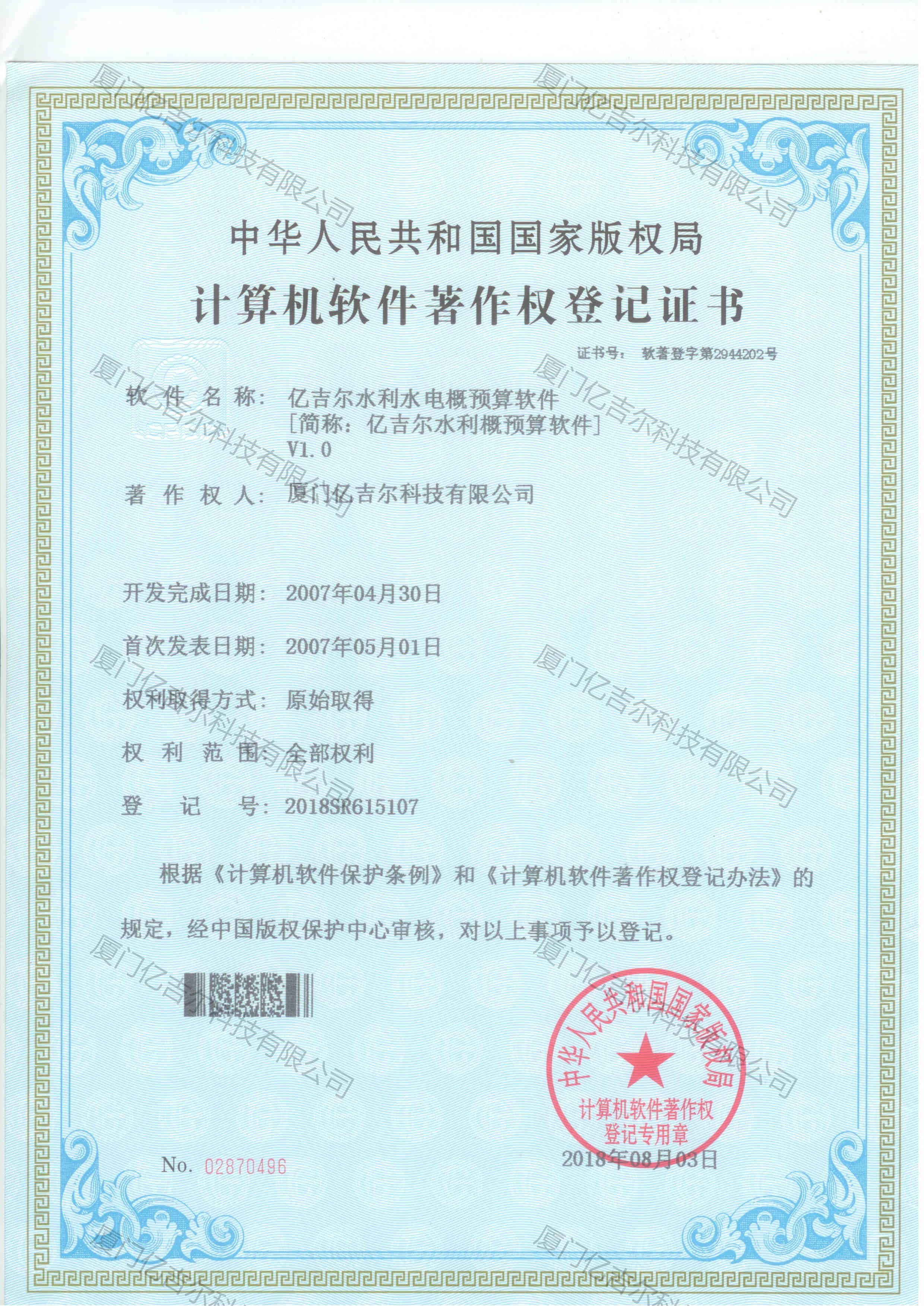 億吉爾水利水電概預(yù)算軟件著作權(quán)登記證書 發(fā)布日期:2018年08月03日 瀏覽次數(shù):3589 關(guān)鍵字: 公司 1/1億吉爾水利水電概預(yù)算軟件著作權(quán)登記證書