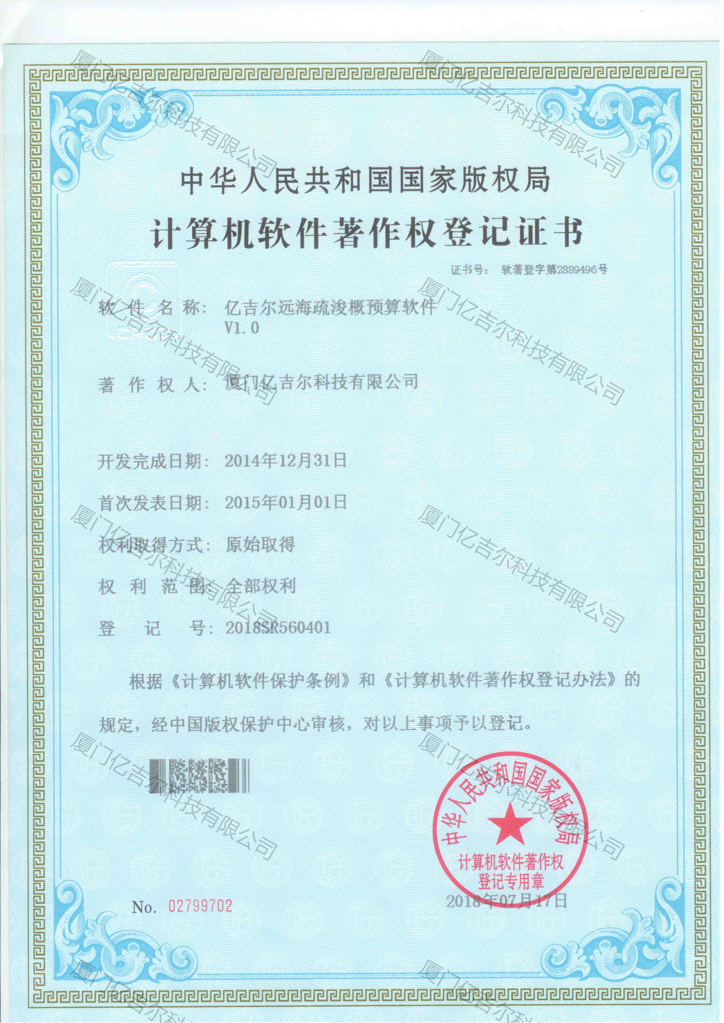 億吉爾遠(yuǎn)海疏浚概預(yù)算軟件著作權(quán)登記證書(shū) 發(fā)布日期:2018年07月17日 瀏覽次數(shù):3646 關(guān)鍵字: 公司 1/1億吉爾遠(yuǎn)海疏浚概預(yù)算軟件著作權(quán)登記證書(shū)